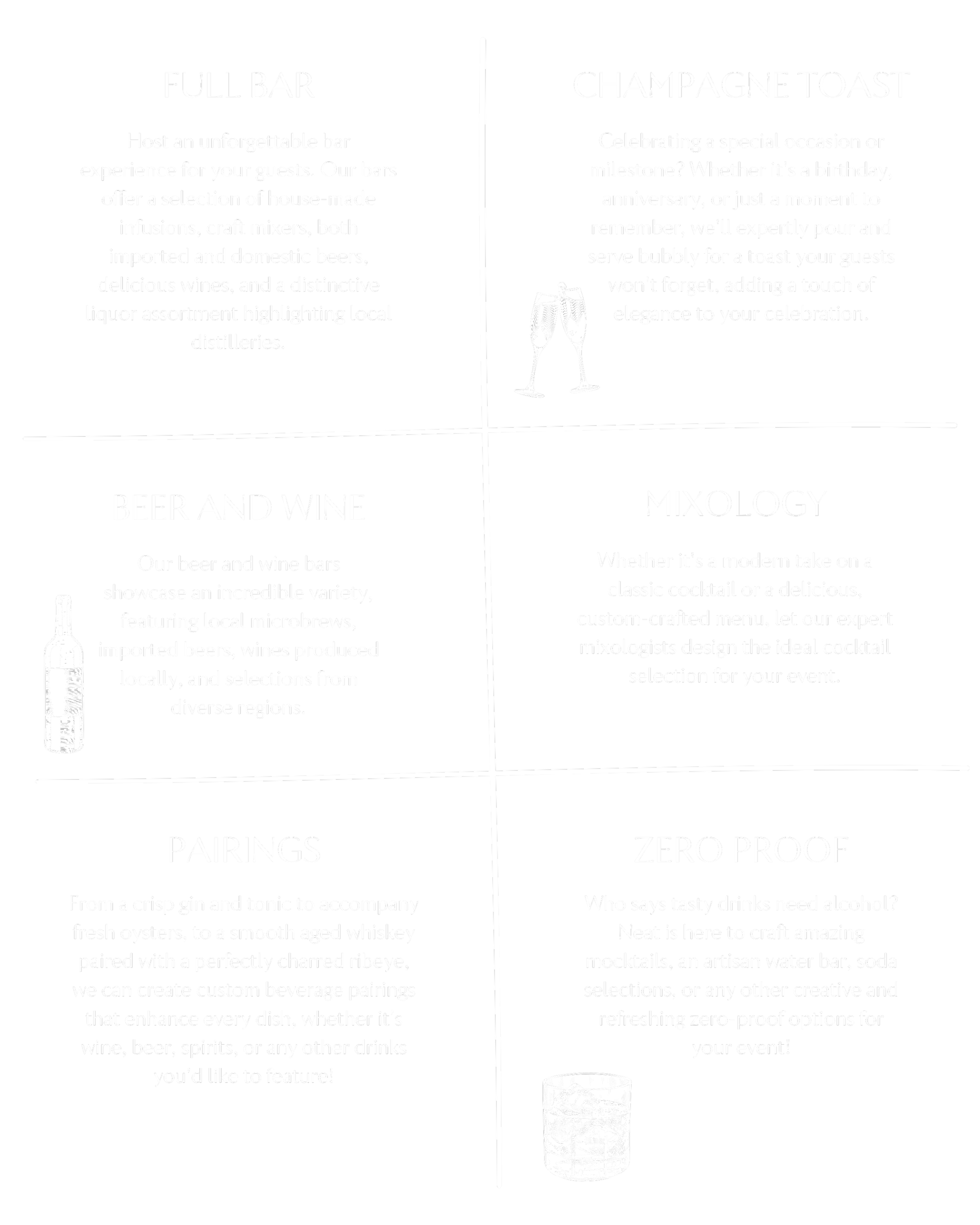 Neat offers a wide range of services, non-alcoholic drinks, customization choices, and more! Below are just a few of the additional services we provide, but don't hesitate to reach out if you have something specific in mind—we likely have what you're looking for!